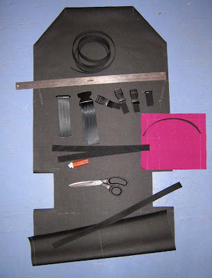 2.5 yards strap webbing. Any kind of 2" webbing you'd like to get. I like seatbelt webbing, but you can only get it at some places (the junkyard is the best, though). Heavy weave nylon webbing is also a good choice.