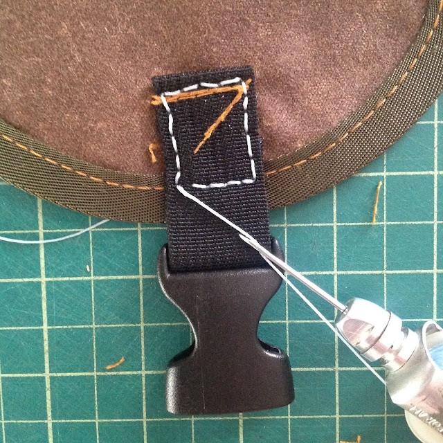 First blood. I like to start on the stitching line closest to the buckle and near the middle of the run. This kind of locks the webbing in place and minimizes webbing creep as you sew. Stick your needle straight down and pull back about an 1/8" or so until a loop forms bellow the needle's eye. This will be on the opposite side from the needle groove. [On most machine needles, this would be where the scarf is, but there's no hook in play here, so no need for a scarf.]